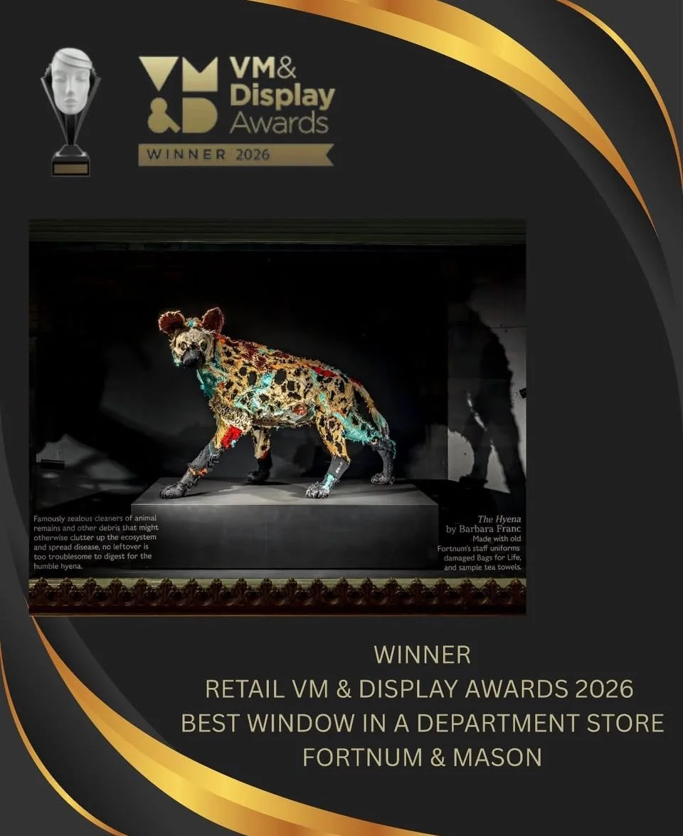 Wow, my Hyena has just won the Best Window in a Department Store!!!! The Awards ceremony held by VM&D (Visual Marketing and Display UK) gave the prize to the Fortnum and Mason Windows, they also won a prize for best environmental use of materials and the wonderful Artist-Champion Head of Display at Fortnum’s , Sallie Smith also won a prize. What a trio of accolades